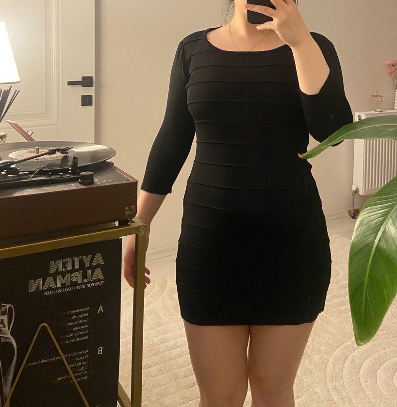 Düz siyah renkli, bisiklet yaka ve uzun kollu, pilili detaylara sahip kadın triko elbise, günlük kullanım için uygundur.
