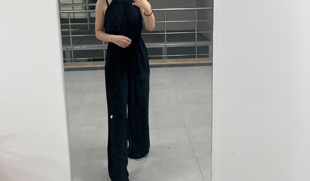 siyah renkli, kolsuz ve yüksek yakalı midi uzunluğunda kadın tulumu. Minimalist ve rahat kesimiyle ofis için şık bir tercih.