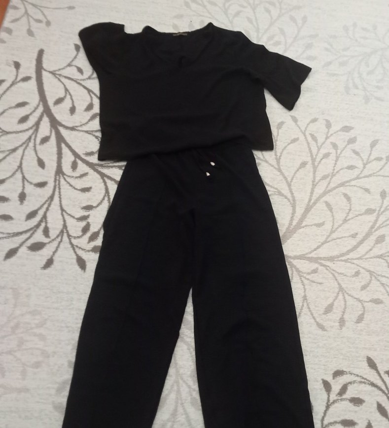Siyah kadın midi tulum, kısa kollu ve yuvarlak yakalıdır. Rahat kesimi ve ipeksi dokusuyla günlük kullanıma uygundur. ✨