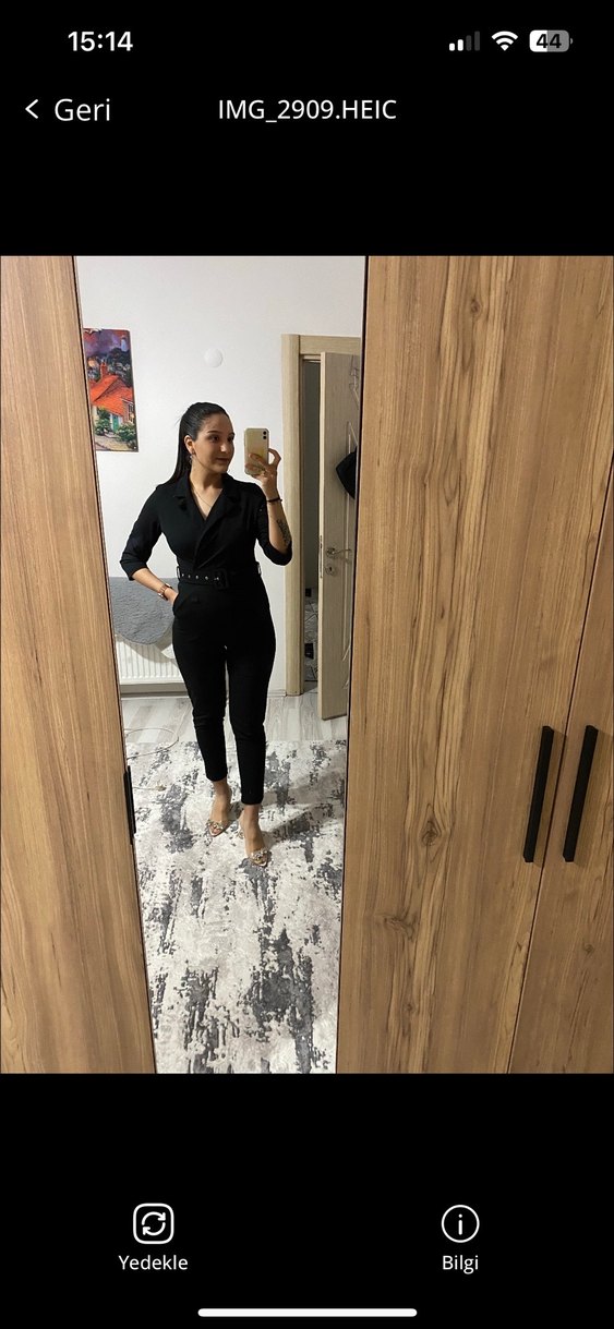 Siyah, ipek gibi kumaştan midi uzunlukta, notched lapel yakalı ve uzun kollu kadın tulumu. Rahat kesimi ve şık duruşuyla ofis için uygundur.