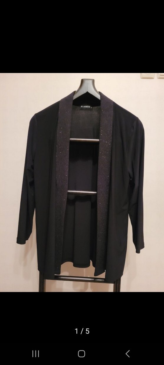 Siyah midi uzun kollu hırka, notched lapel yakaya ve dökümlü ön tarafa sahiptir. Sentetik kumaştan yapılmış,