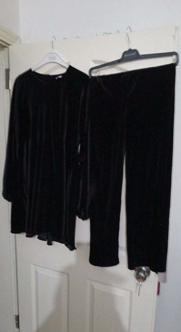 Kadınlar için siyah, midi boy, uzun kollu, bol kesim ve ipeksi dokulu kadife takım. Günlük kullanım için gotik, zahmetsiz şıklık sunar. 40-42-44 olur pantolon beli lastikli