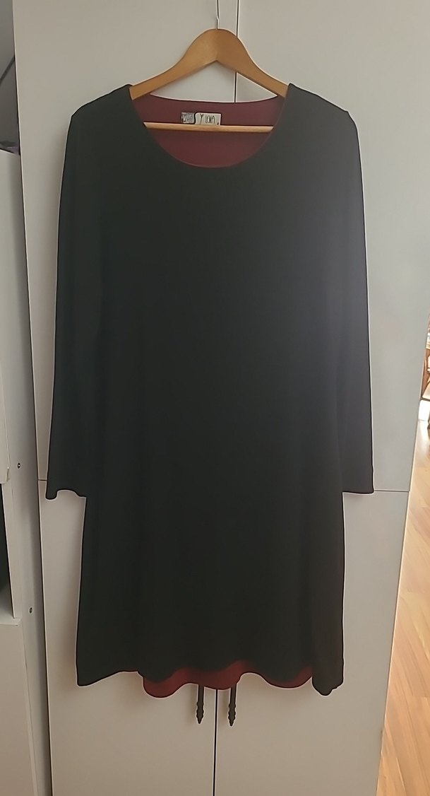 Siyah renkli kadın Elbise, uzun kollu, yuvarlak yaka ve salaş kesimdir. İpeksi kumaşıyla ofis kullanımı için uygundur.