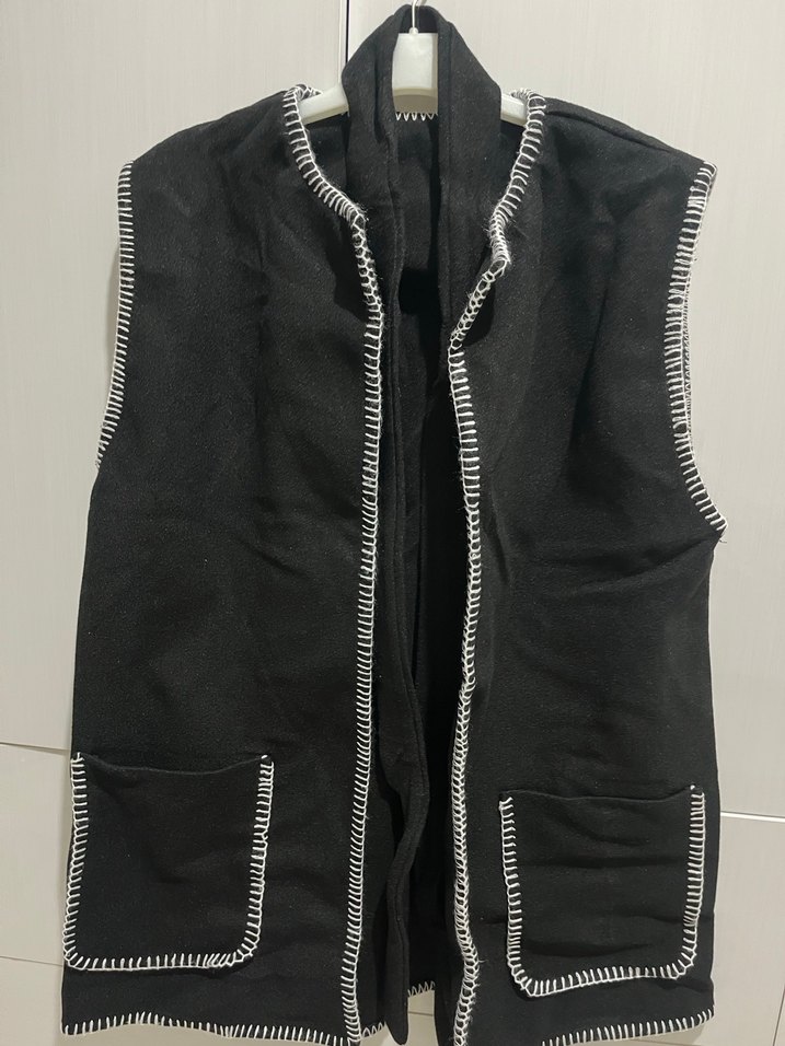 Siyah kolsuz bu yelek, notched lapel yaka ve midi boydadır. Beyaz kontrast dikişlerle detaylandırılmış, rahat ve sıcak dokulu kumaştan üretilmiştir.