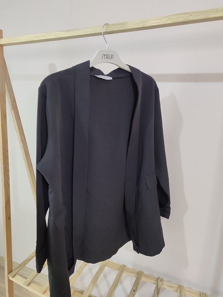 Siyah, mini boy, uzun kollu kadın blazer. İpek gibi kumaş, düşük yakalı ve regular fit. Ofis için şık ve rahat bir tercih.