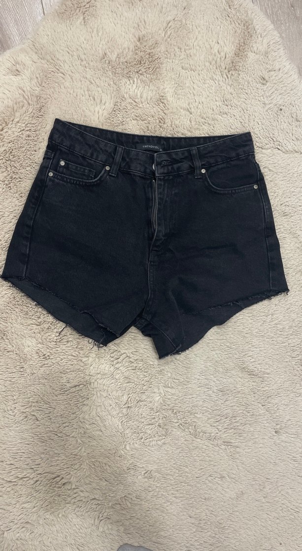 Siyah, bol kesim mini denim şort, kısa boy ve ham kenar detaylarıyla günlük rahat ve trend sokak stili sunar. ✨