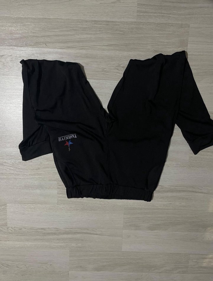Siyah, düz renkli kadın eşofman takımı, bol kesim, uzun kollu ve yuvarlak yakalıdır. Sentetik kumaştan üretilmiş, kısa boyu ile spor ve günlük kullanıma uygundur.