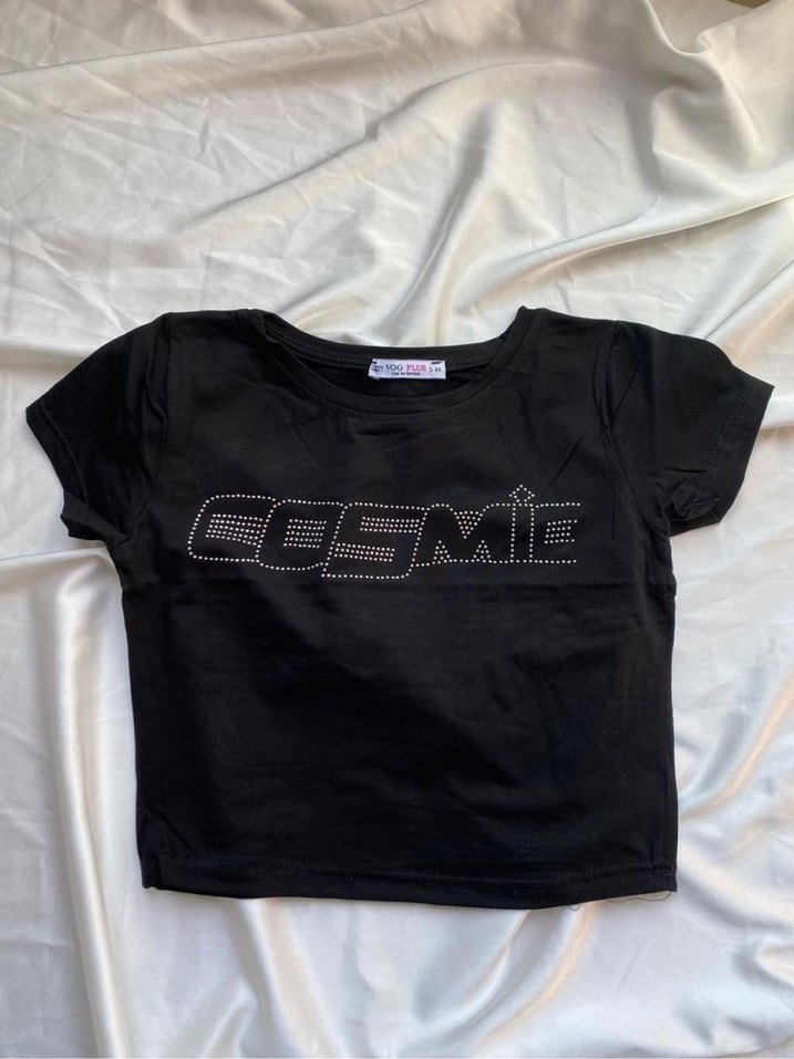 Siyah, dar kesim, kısa kollu, yuvarlak yakalı tişört. 'COSMIE' yazısı payetlerle süslenmiş. Sentetik kumaştan, günlük kullanıma uygun.