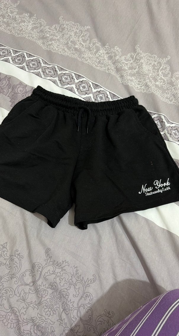 Siyah pamuklu mini şort, bol kesim ve lastikli bel detayına sahip, küçük New York baskılı, gündelik kullanım için uygun.