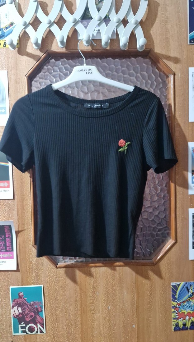 kısa kollu, bisiklet yaka siyah mini tişört. Göğsünde küçük gül baskısı ve rahat sentetik kumaş kullanılmış.