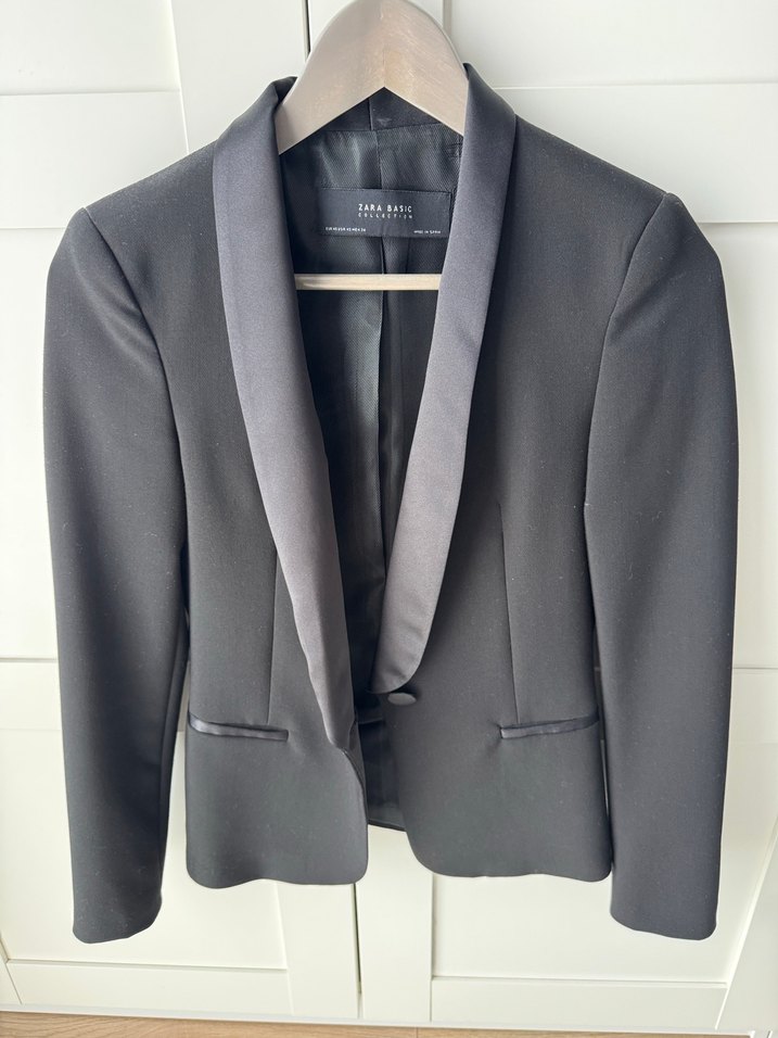 Siyah renkte, düğmeli ve saten dokulu kadın blazer ceket, normal kesim ve askılı kollara sahiptir. Modern klasik tarzıyla ofis kullanımı için uygundur.