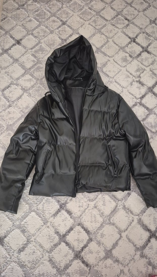 Fitted kesim siyah deri ceket, kapüşonlu ve uzun kolludur. Sade tasarımıyla günlük kullanıma uygundur. S beden