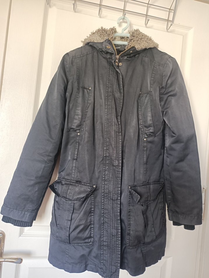 siyah renkte, kürk detaylı, uzun kollu ve notched lapel yaka ile tasarlanmış, fitted kesim midi boy kot mont. Rahat sokak stili için uygun. iç ceket kısmı (kürklü kısım) çıkartılıp, dış ceketi trençkot şeklinde kullanılabiliyor. (Baharlık ceket olarak) çok kullandım öyle çok pratik