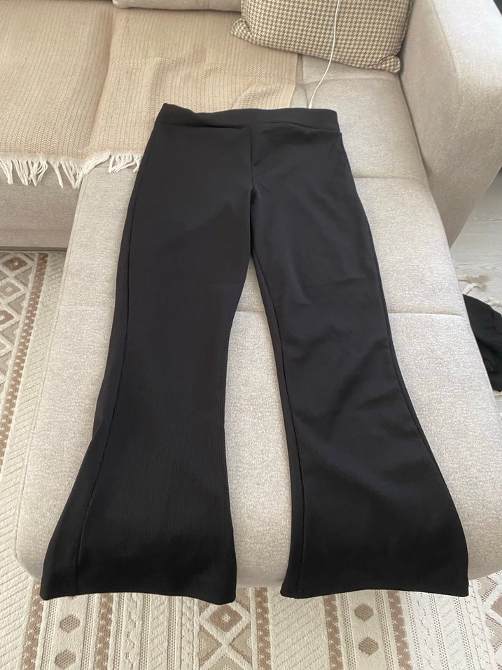 Düz siyah, sentetik kumaştan yapılmış, normal boy ve ispanyol paça kadın pantolon. Günlük kullanıma uygun, zahmetsiz şıklık sunar.