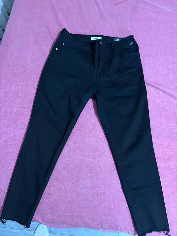 Siyah kot kumaştan, normal kesim kadın pantolon. Desensiz ve gündelik kullanıma uygun, rahat ve şık bir stil sunar.
