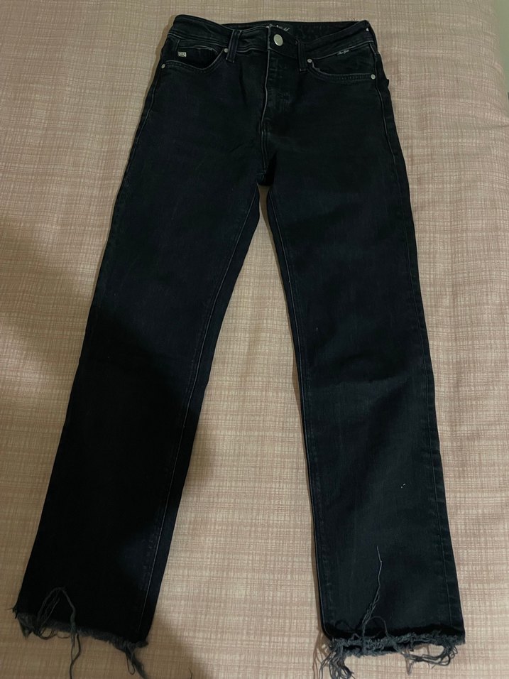 Siyah denim kumaştan yapılmış, normal kesim kadın kot pantolon. Desensiz, ham kenarlı ve gündelik kullanıma uygun, zahmetsiz şıklık sunar. BEDENİNİ BİLMİYORUM.