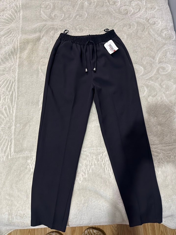 Siyah, normal kesim, midi boy, lastikli bel detaylı kadın kumaş pantolon, günlük kullanıma uygun rahat ve şık görünümlü.