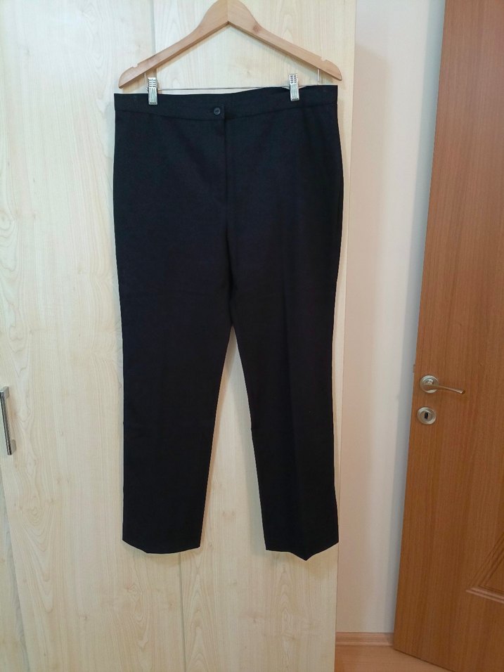 Siyah, normal kesim, kadın pantolonu. Desensiz, ofis için uygun, rahat ve şık görünüme sahip.