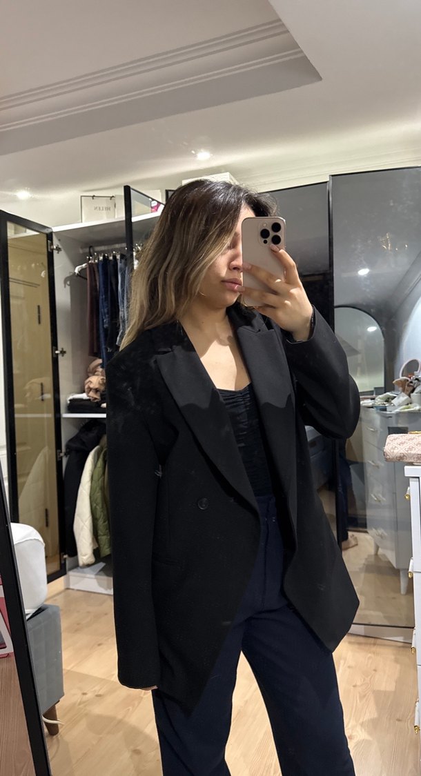 Siyah renkli, notch yakalı ve uzun kollu kadın blazer, ipeksi kumaştan üretilmiştir. Normal kesim ve midi boyda olan bu blazer, ofis ve sokak stiline uygundur. Desensiz tasarımıyla zahmetsiz şıklık sunar.