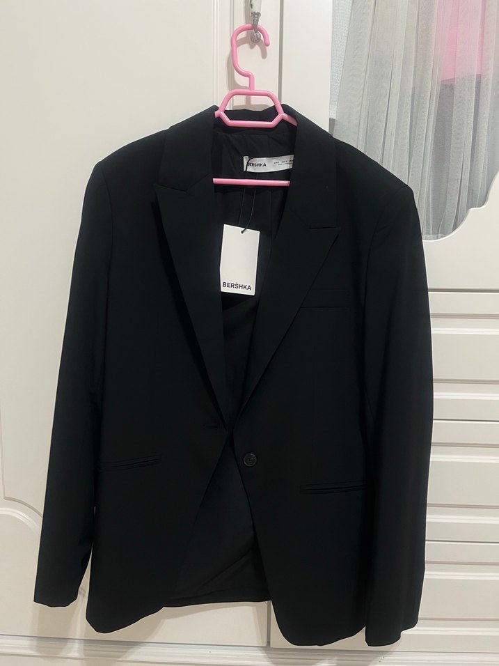 Siyah renk, kesik yakalı ve uzun kollu kadın blazer ceket. Vatkalı bedeni s ama oversize kalıp etiketi üstünde