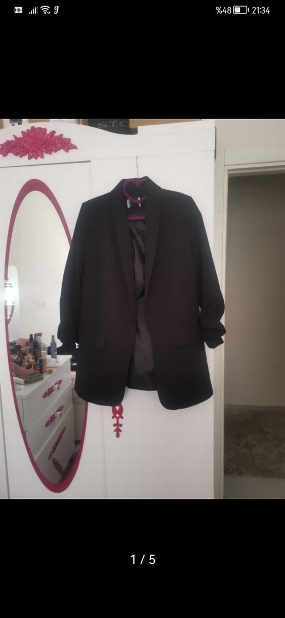 Siyah renkli, , normal boyda kadın ofis blazeri. Notch yaka ve uzun kolludur, sentetik kumaştan yapılmıştır. Düzenli kesim ve goth iş tarzına uygundur.