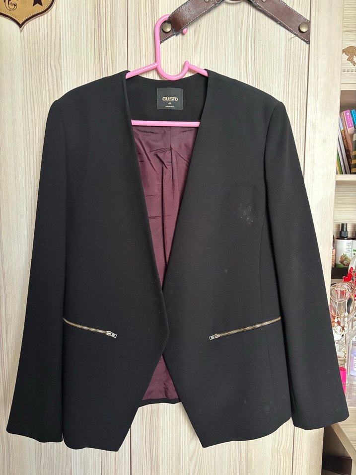 Kadınlar için siyah, normal uzunlukta, saten görünümlü kumaştan, fermuarlı cepli ve uzun kollu klasik kesim ofis blazeri.