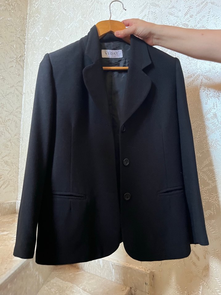Siyah renkli, düğmeli, ipeksi dokulu kadın ofis blazeri. Normal uzunlukta, uzun kollu, klasik şıklık ve normcore tarzında, VEDAT etiketli.