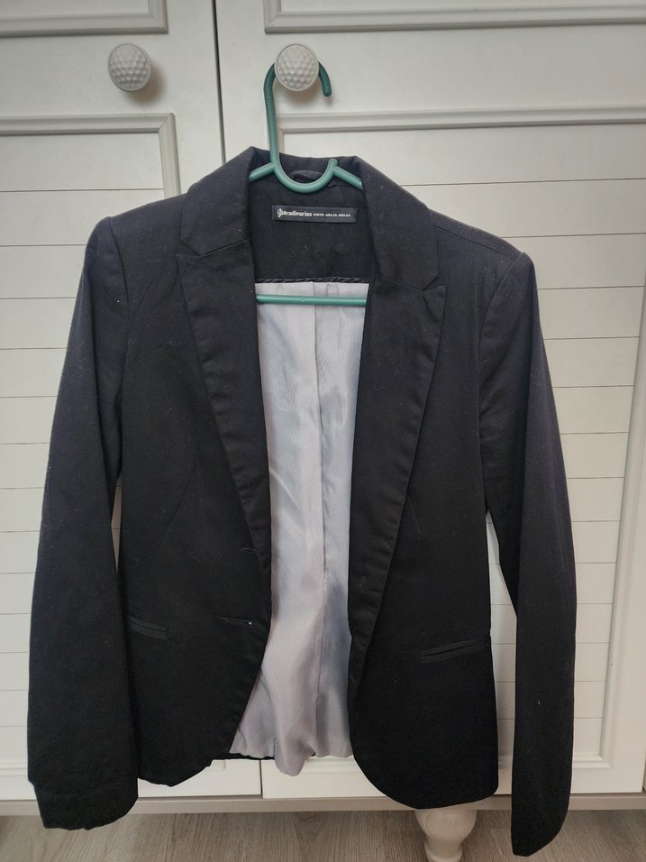 Siyah kadın blazer, kesik yaka, uzun kollu ve düğmeli. Normal kesim, midi boy ve sentetik kumaştan, ofis kullanımı için uygun.