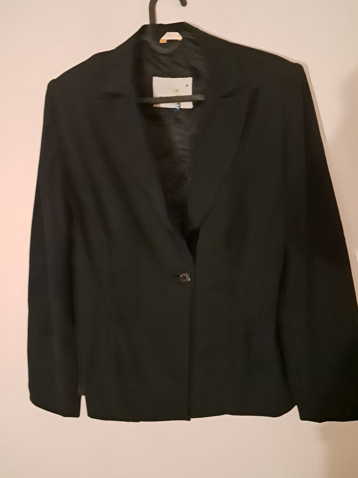 Siyah renkli, düğmeli, ipeksi dokulu kadın ofis blazeri. Uzun kollu, normal kesim ceket iki kol arası 43cm boy 62cm