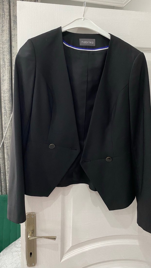 Düğmeli, normal boy, siyah kadın blazer. Düz, uzun kollu ve iş ortamına uygun sentetik kumaştan yapılmıştır.