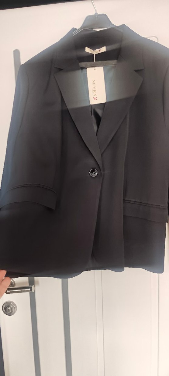 Siyah renkli, düğmeli ve yakalı kadın blazeri, normal boyda ve uzun kolludur. Ofis kullanımı için uygun, klasik şıklık sunar. Marka: NEVRA etiketli