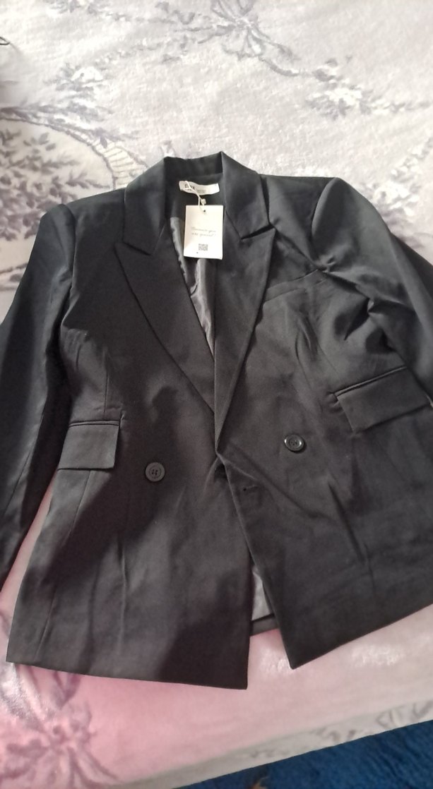Siyah renkli, düğmeli ve normal boyda kadın blazeri. İpek gibi dokusu, kruvaze yaka ve uzun kolludur. Ofis ve günlük şıklık için uygundur.
