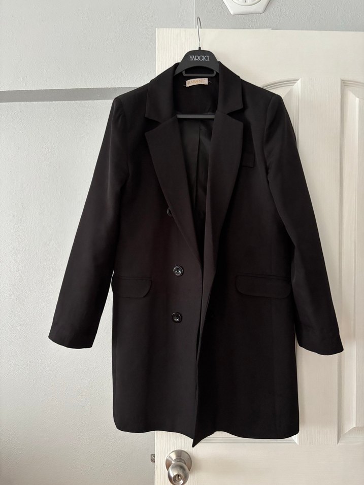 Siyah kadının ofis blazeri, düğmeli, normal midi boyda ve satenimsi kumaştan. Klasik şıklık için kesim ve yakası notched lapel.