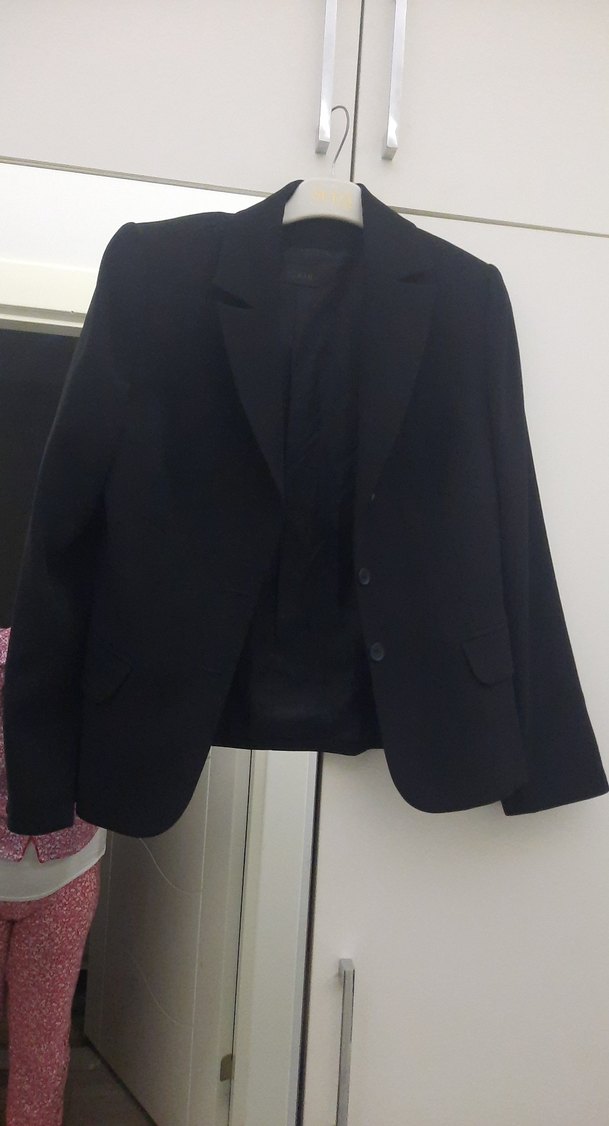 Siyah kadın blazeri, keskin yaka, uzun kollu ve düğmeli. Ofis ortamına uygun, klasik şıklık sunar. Yumuşak ve ipeksi dokudadır. 2 kere kullanıldı hiçbir kusuru yırtık sökük deformesi yoktur tertemiz sorunsuzdur