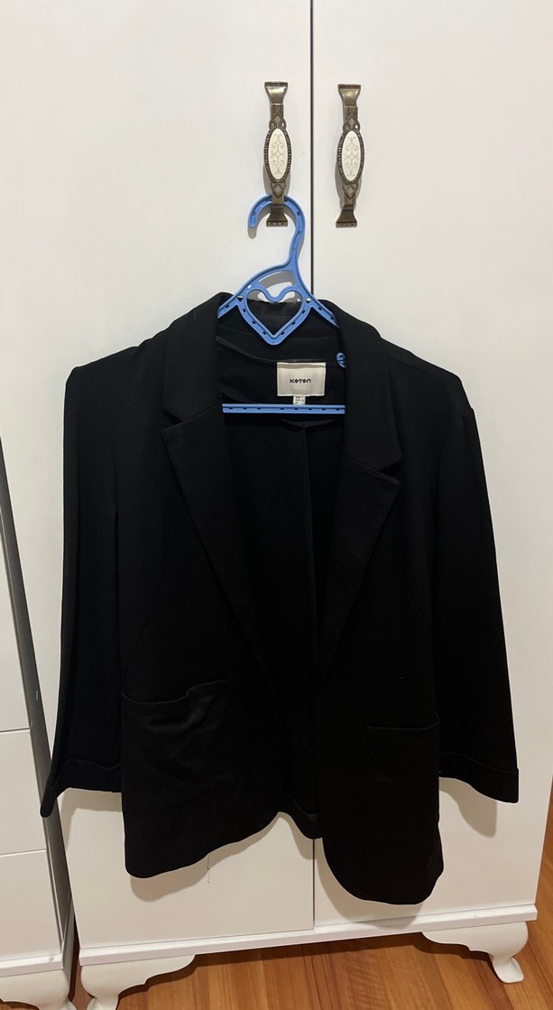 Siyah kadın blazer, notched lapel yakalı ve askılı kollu, yumuşak sentetik kumaştan. Regular fit ve normal boyda, ofis için uygun, zahmetsiz şıklık sunar.
