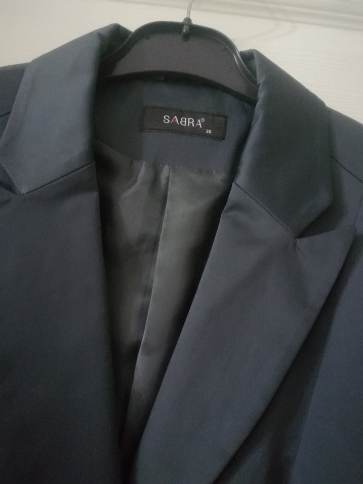 Siyah, düğmeli, ipeksi kumaştan yapılmış, normal kesim ve uzun kollu kadın ofis blazeri. Yaka kısmında SA8RA etiketi bulunur.