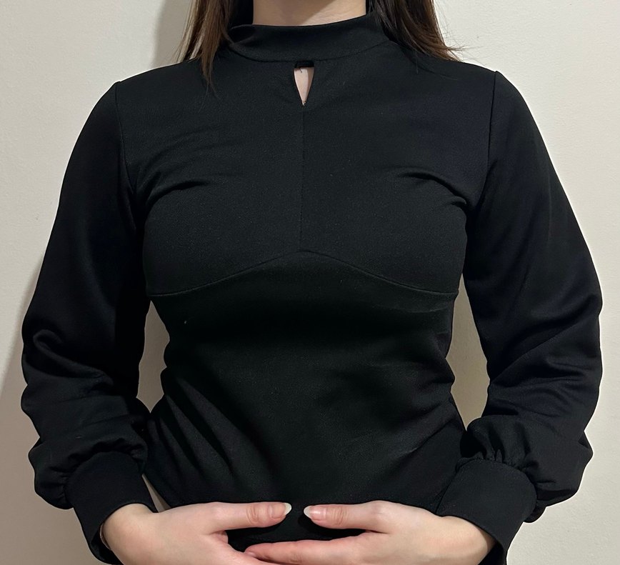 Boyunda küçük yırtmaç detayı olan, uzun kollu, siyah, vücuda oturan kadın bluzu. Düz tasarımı ve sentetik kumaşıyla ofis kullanımı için uygundur. Defo yok