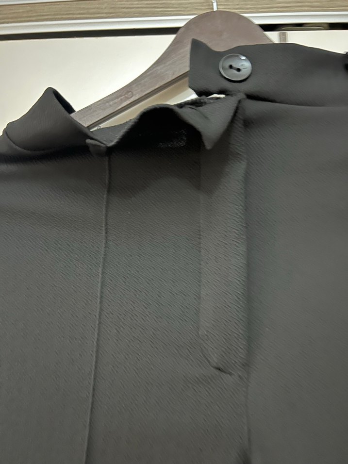 Siyah kadın ofis elbisesi, yüksek yakalı ve uzun kolludur. Düğmeli detaylara sahip, rahat kesimli ve uzun boydadır. Şık ofis kombinleri için uygundur.