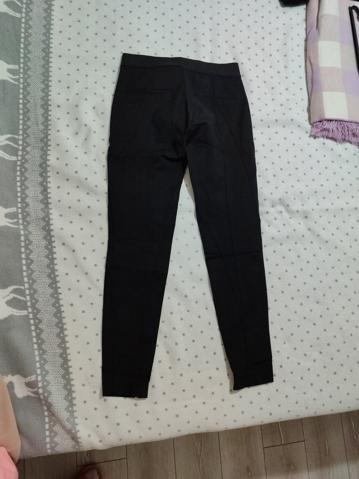 Siyah kadın kumaş pantolon, regular fit ve midi boyda, yumuşak sentetik kumaştan. Ofis için uygun, trend casual tarzda.