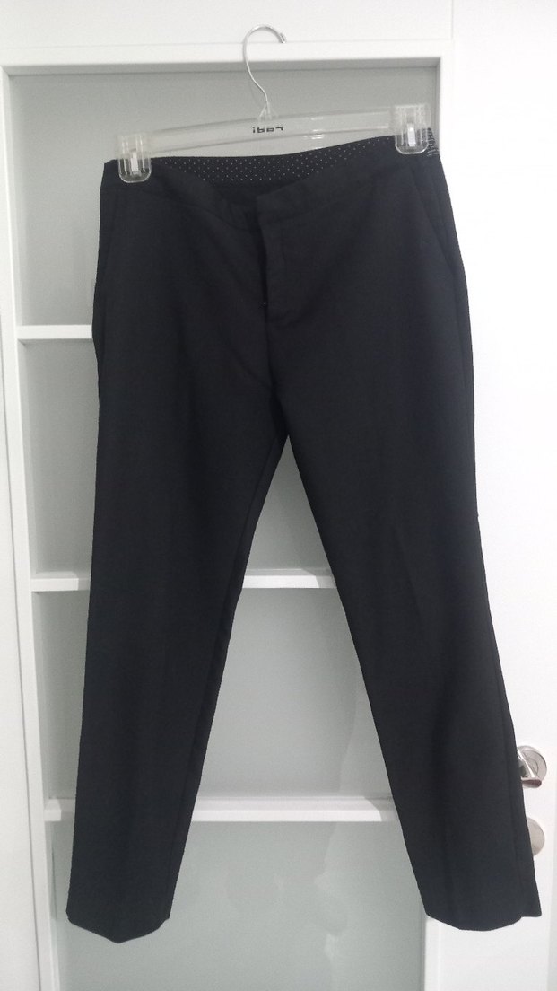 Siyah, regular fit ve midi boyda kadın kumaş pantolon. Ofis ve iş ortamları için uygun, rahat ve şık bir görünüme sahip.