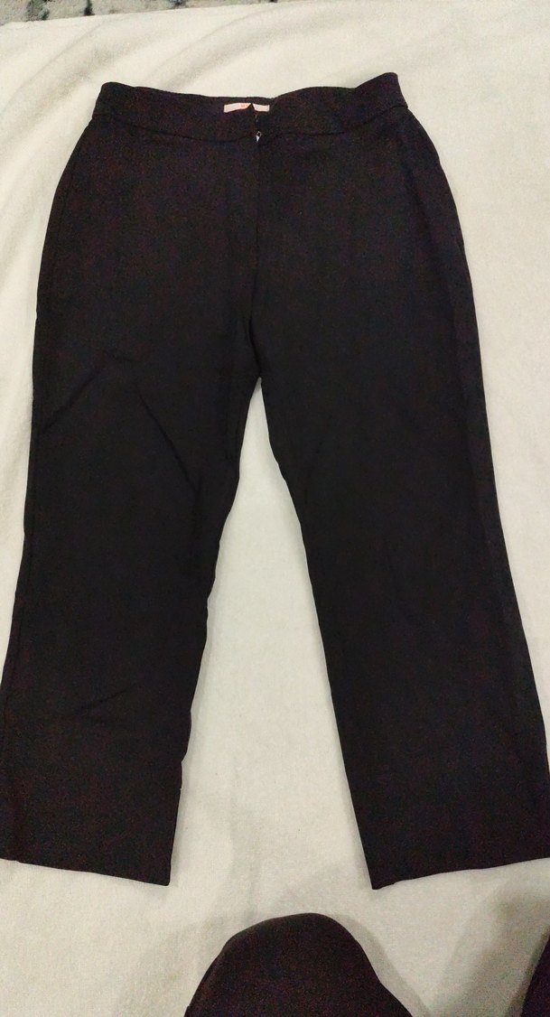 Siyah, ipeksi kumaştan, midi boy, regular fit kadın pantolon. Ofis kullanımı için sade ve rahat bir normcore tarz sunar. kapri