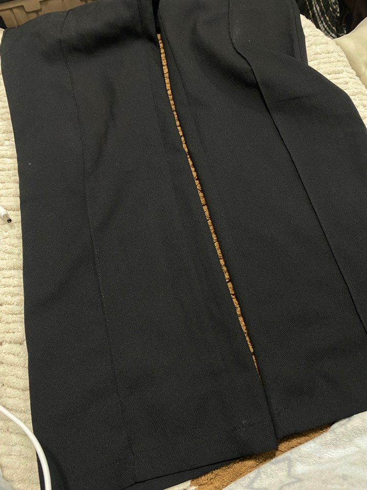 Kadınlar için siyah kumaş pantolon, regular fit ve uzun paça. İnce yırtmaç detaylı, parlak ve ipeksi dokulu, ofis kullanımı için uygundur. Düz ve sade tasarım.