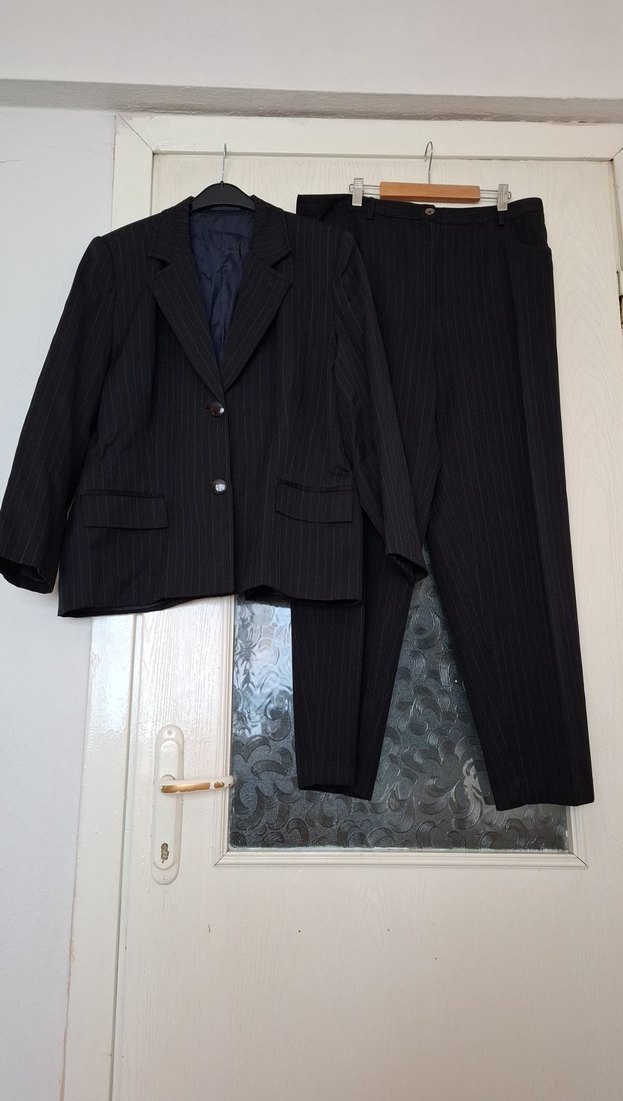 Siyah renkli, regular fit kadın ofis takımıdır. Düğmeli ceket ve uzun kollu, normal boy pantolondan oluşur. Sentetik kumaştan yapılmıştır, klasik iş stiline uygundur. özel dikim 44 beden. pantolon bel 45 boy 101 cm.ceket iki kol arası 57 boy 66 cm.