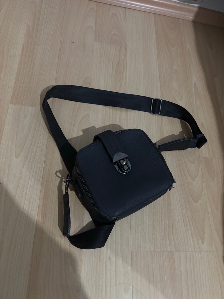 Siyah , tokalı kapaklı ve ayarlanabilir askılı kadın omuz çantası. Günlük kullanıma uygun, minimalist ve desensiz kutu bir çanta.