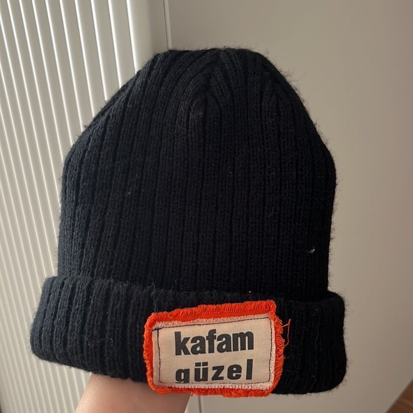 Siyah örgü kadın bere, rahat tasarımlı ve üzerinde "kafam güzel" yazılı bir yama bulunur.