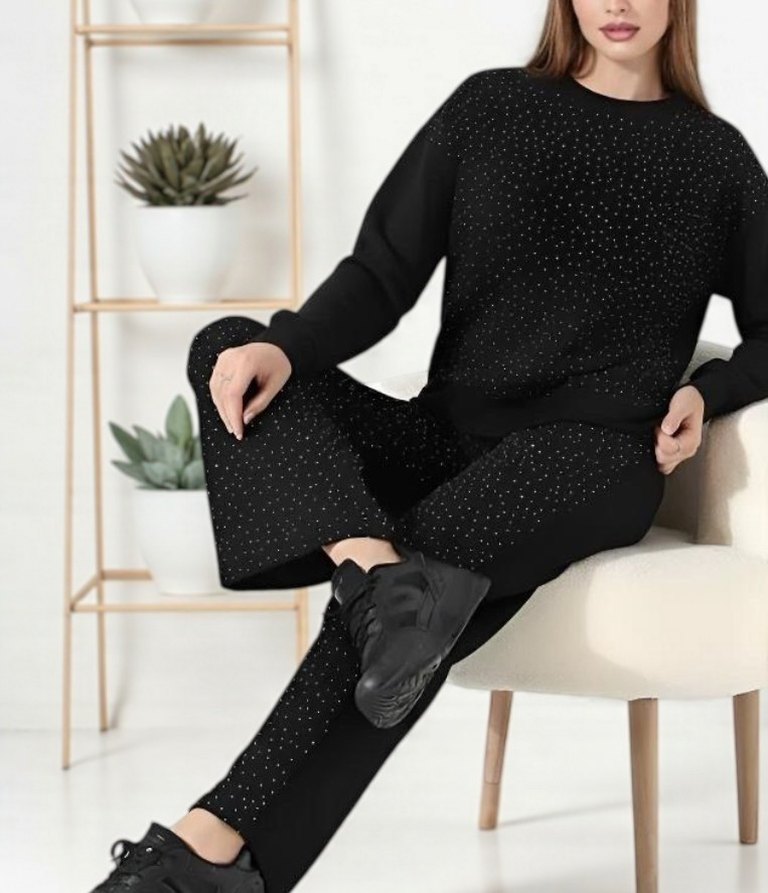 Siyah Kadın Örgü Detaylı Rahat Eşofman Takımı