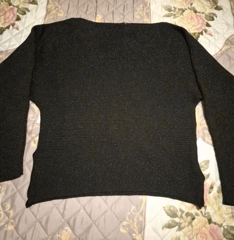 Siyah örgü, yuvarlak yaka ve uzun kollu salaş kesim kazak, günlük rahat kullanım için ideal.