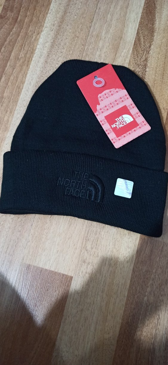 Siyah örgü bere, yumuşak ve sıcak fleece kumaştan, 'The North Face' logosu nakışlı, trend sokak stili için uygun.