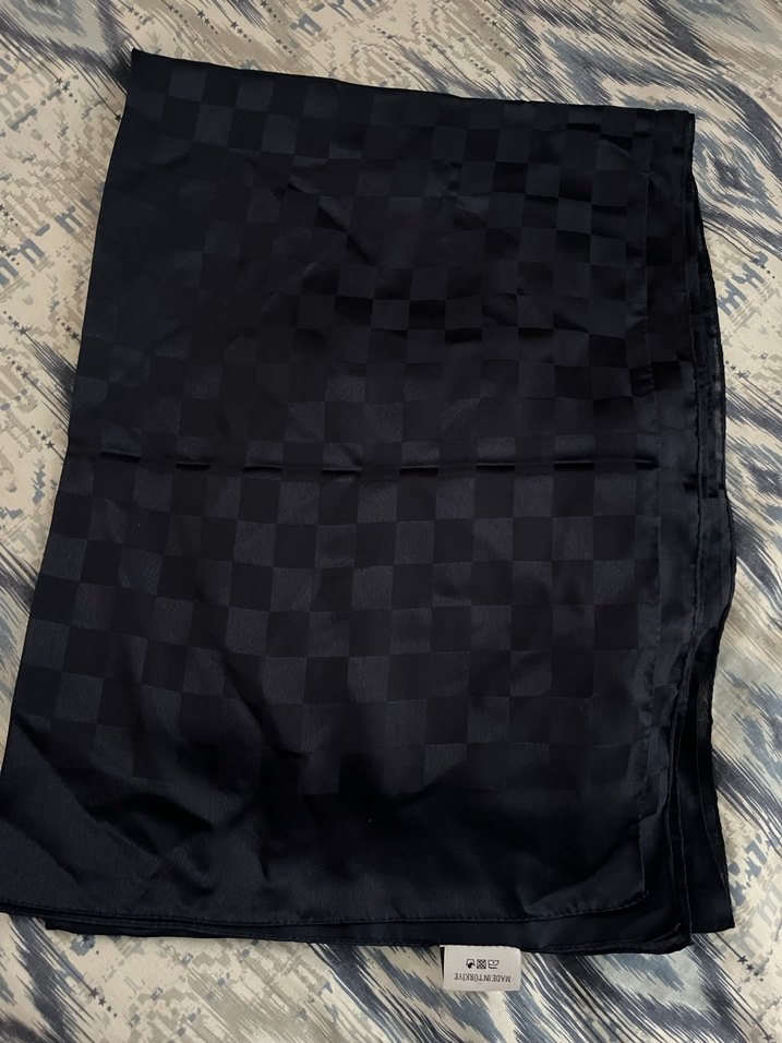 Drapeli tasarıma sahip siyah kadın örtüsü, ince kare desenli ve yumuşak sentetik kumaştan üretilmiştir. Minimalist ve goth tarzlara uygundur.