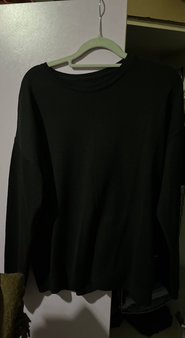 Siyah, yuvarlak yakalı, uzun kollu, oversize kesim, yumuşak ve sıcak kumaştan basic kazak. Lcw marka m beden ince kazak. Kalçanın biraz üzerinde bitiyor boyu. Siyah renk.